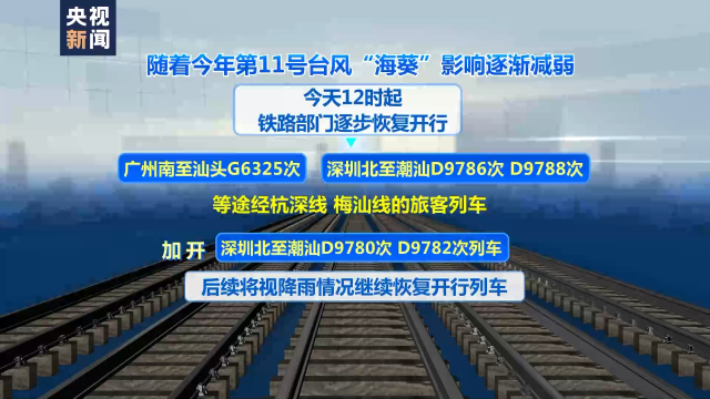 隨著今年第11號臺風(fēng)“??庇绊懼饾u減弱,5日12時(shí)起,鐵路部門逐步恢復(fù)開行廣州南至汕頭G6325次、深圳北至潮汕D9786次、D9788次等途經(jīng)杭深線、梅汕線的旅客列車,加開深圳北至潮汕D9780次、D9782次列車。后續(xù)將視降雨情況,繼續(xù)恢復(fù)開行列車。