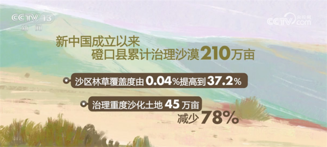 數(shù)據(jù)顯示,新中國(guó)成立以來(lái),磴口縣累計(jì)治理沙漠210萬(wàn)畝,沙區(qū)林草覆蓋度由0.04%提高到37.2%,治理重度沙化土地45萬(wàn)畝,減少78%,向黃河年輸沙量減少到370萬(wàn)噸,降低94.7%,沙漠治理呈現(xiàn)出“整體好轉(zhuǎn)、改善加速”的良好態(tài)勢(shì),也因此形成了防沙治沙“磴口模式”。