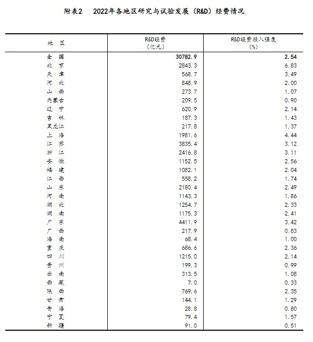 2022年,全國(guó)共投入研究與試驗(yàn)發(fā)展(R&D)經(jīng)費(fèi)30782.9億元,比上年增加2826.6億元,增長(zhǎng)10.1%;研究與試驗(yàn)發(fā)展(R&D)經(jīng)費(fèi)投入強(qiáng)度(與國(guó)內(nèi)生產(chǎn)總值[2]之比)為2.54%,比上年提高0.11個(gè)百分點(diǎn)[3]。按研究與試驗(yàn)發(fā)展(R&D)人員全時(shí)工作量計(jì)算的人均經(jīng)費(fèi)為48.4萬元,比上年下降0.5萬元。