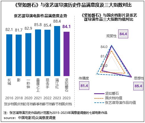 張藝謀導(dǎo)演新作《堅如磐石》獲得觀眾滿意度評分84.1分,居2023年國慶檔調(diào)查五部影片首位,也是檔期內(nèi)唯一一部滿意度超84分的影片,保持了張藝謀導(dǎo)演系列電影作品的高滿意度水平。