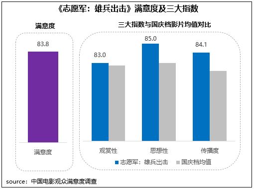陳凱歌執(zhí)導(dǎo)的抗美援朝題材影片《志愿軍:雄兵出擊》觀眾滿意度83.8分,與檔期第一名分差僅0.3分。