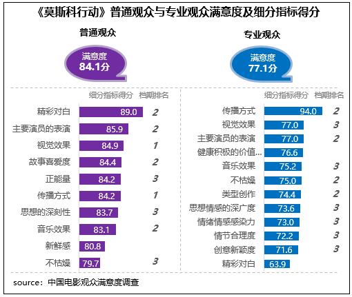 在不同觀眾評價上,《莫斯科行動》相對更受普通觀眾青睞,普通觀眾滿意度得分84.1分,居檔期第二位,與《堅如磐石》相差0.1分;專業(yè)觀眾滿意度得分77.1分,居檔期第三位。在細分指標(biāo)中,影片視覺效果和主要演員的表演均得到了不同觀眾的高度認可,得分為各自評價指標(biāo)體系的前三名,也都居檔期五部影片的前三位。