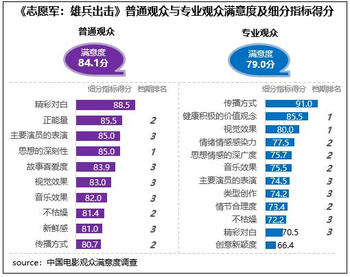 在不同觀眾評價上,《志愿軍:雄兵出擊》相對更受專業(yè)觀眾青睞,專業(yè)觀眾滿意度得分79.0分,居檔期第二位;在細分指標(biāo)中,健康積極的價值觀念、視覺效果兩項指標(biāo)得分居檔期首位,同時分別居2023年調(diào)查50部影片的第4位和第8位。影片普通觀眾滿意度得分84.1分,居檔期第三位,僅比《堅如磐石》和《93國際列車大劫案:莫斯科行動》分別低0.1分、0.02分,細分指標(biāo)中思想深刻性得分居檔期首位。