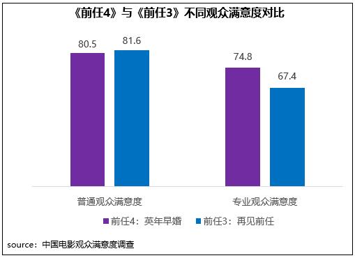 《前任4:英年早婚》在同系列影片輕松、寫實創(chuàng)作風(fēng)格基礎(chǔ)上,進階到婚姻話題探討,并進一步強化對觀眾現(xiàn)實情感生活的細致洞察,成為當(dāng)代人的愛情圖鑒。在不同觀眾評價中,影片相對更受專業(yè)觀眾的青睞,專業(yè)觀眾滿意度得分74.8分,高于上一部作品7.4分,其中精彩對白、傳播方式得分居檔期第二和第三位;但普通觀眾對其評價一般,滿意度得分80.5分,比上一部低1.1分。