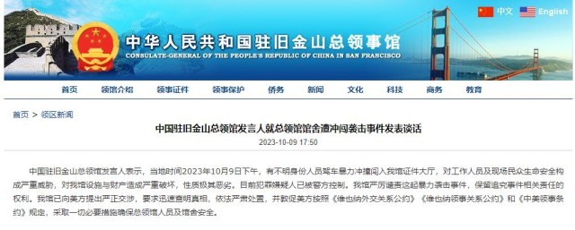 中國駐舊金山總領館發(fā)言人就總領館館舍遭沖闖襲擊事件發(fā)表談話