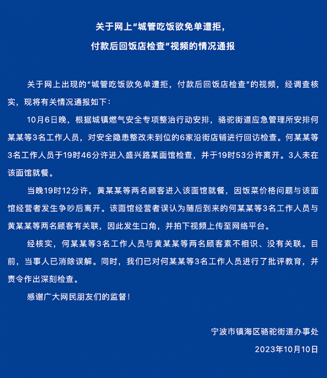 關(guān)于網(wǎng)上出現(xiàn)的“城管吃飯欲免單遭拒,付款后回飯店檢查”的視頻,經(jīng)調(diào)查核實(shí),現(xiàn)將有關(guān)情況通報(bào)如下: