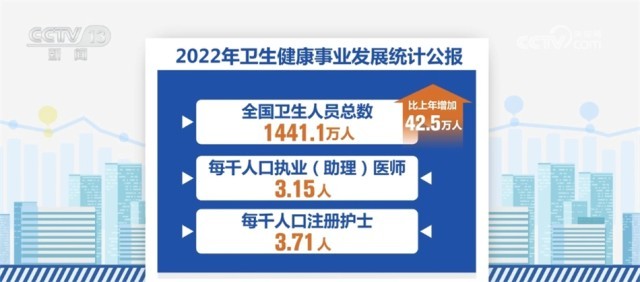 《公報(bào)》顯示,我國醫(yī)療衛(wèi)生資源總量繼續(xù)增加。到2022年末,全國醫(yī)療衛(wèi)生機(jī)構(gòu)達(dá)到1032918個(gè),比上年增加1983個(gè)。全國共設(shè)置13個(gè)類別的國家醫(yī)學(xué)中心和兒童類別的國家區(qū)域醫(yī)療中心。全國醫(yī)療衛(wèi)生機(jī)構(gòu)床位975.0萬張,每千人口醫(yī)療衛(wèi)生機(jī)構(gòu)床位數(shù)由2021年的6.70張?jiān)黾拥?022年的6.92張。全國衛(wèi)生人員總數(shù)1441.1萬人,比上年增加42.5萬人。每千人口執(zhí)業(yè)(助理)醫(yī)師3.15人,每千人口注冊(cè)護(hù)士3.71人。