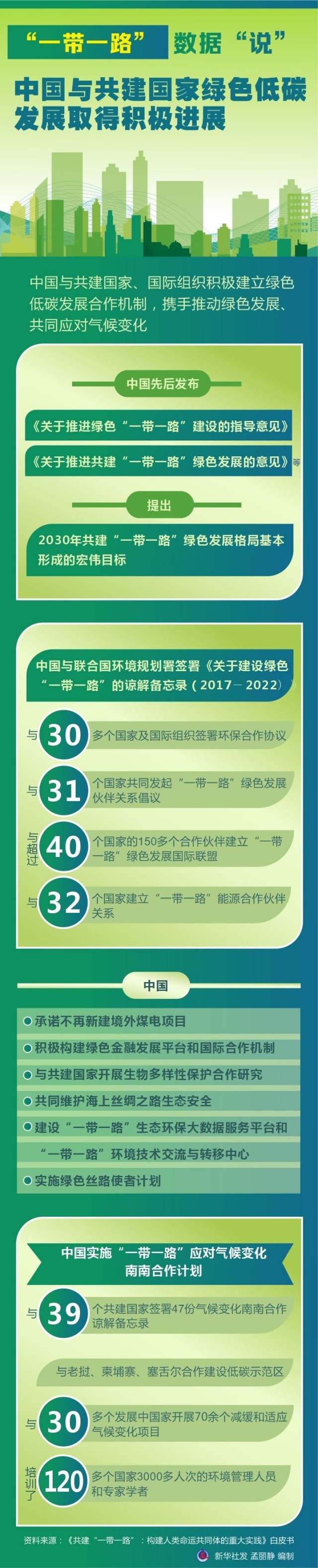 綠色低碳發(fā)展取得積極進(jìn)展。中國(guó)與共建國(guó)家、國(guó)際組織積極建立綠色低碳發(fā)展合作機(jī)制,攜手推動(dòng)綠色發(fā)展、共同應(yīng)對(duì)氣候變化。中國(guó)先后發(fā)布《關(guān)于推進(jìn)綠色“一帶一路”建設(shè)的指導(dǎo)意見(jiàn)》《關(guān)于推進(jìn)共建“一帶一路”綠色發(fā)展的意見(jiàn)》等,提出2030年共建“一帶一路”綠色發(fā)展格局基本形成的宏偉目標(biāo)。