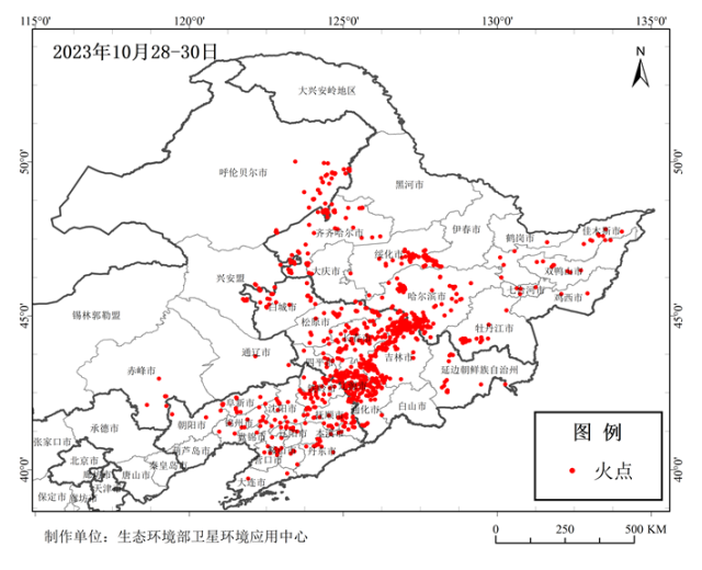 10月28–30日東北地區(qū)秸稈焚燒火點(diǎn)分布圖