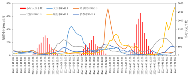 10月28日0時(shí)-31日8時(shí),哈爾濱及周邊城市PM2.5濃度以及東北40城市秸稈焚燒小時(shí)火點(diǎn)個(gè)數(shù)變化情況。