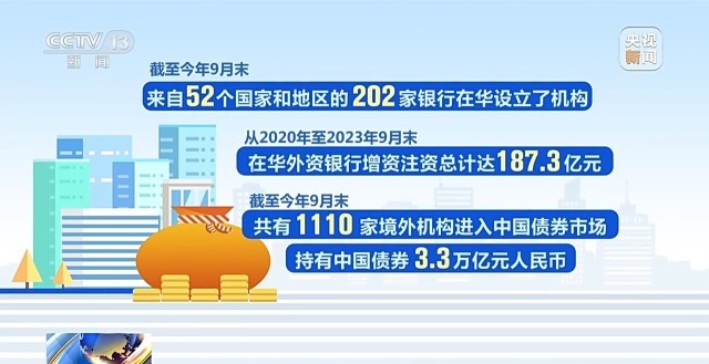 金融開放步伐加快。截至今年9月末,來自52個(gè)國家和地區(qū)的202家銀行在華設(shè)立了機(jī)構(gòu);從2020年至2023年9月末,在華外資銀行增資注資總計(jì)達(dá)187.3億元。截至今年9月末,共有1110家境外機(jī)構(gòu)進(jìn)入中國債券市場,持有中國債券3.3萬億元人民幣。