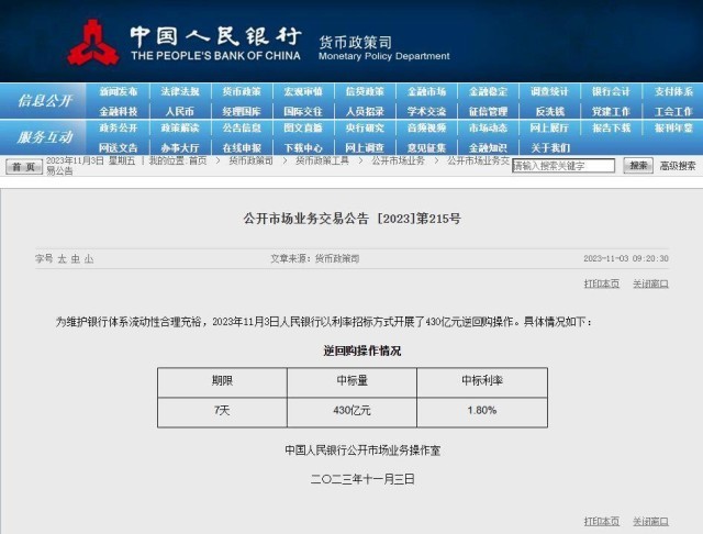 據(jù)央行官網(wǎng)消息,為維護(hù)銀行體系流動(dòng)性合理充裕,2023年11月3日中國(guó)人民銀行以利率招標(biāo)方式開展了430億元逆回購(gòu)操作。具體情況如下: