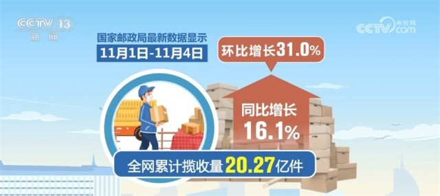 國家郵政局今天(11月5日)發(fā)布,快遞業(yè)從11月開始迎來業(yè)務旺季。最新數(shù)據(jù)顯示,11月1日至11月4日,全網(wǎng)累計攬收量20.27億件,同比增長16.1%,環(huán)比增長31.0%。今年快遞業(yè)務旺季從11月1日開始,到2024年春節(jié)前夕結(jié)束,時長102天。