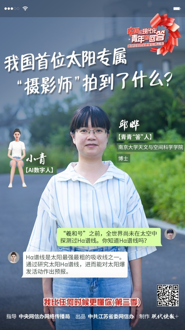 11月7日,“中國式現(xiàn)代化·青年的回答——我比任何時候更懂你(第三季)”系列短視頻之《我國首位太陽專屬“攝影師”拍到了什么?》正式上線。本集視頻中,青青“答”人——南京大學天文與空間科學學院博士邱曄和AI數(shù)字人小青,為大家展示了我國首顆探日衛(wèi)星“羲和號”拍攝到的畫面,解釋了“羲和號”超長全稱里的兩個關(guān)鍵詞的含義。