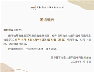 記者從侵華日軍南京大屠殺遇難同胞紀(jì)念館了解到,因場館籌備重要活動(dòng)及設(shè)備維修需要,該館定于2023年11月13日(周一)至12月13日(周三)期間閉館,12月14日起正常開放。
