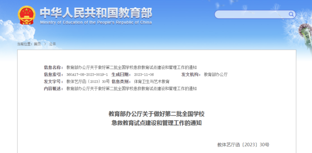 通知一并發(fā)布《第二批全國學(xué)校急救教育試點工作指南》,從總體要求、重點任務(wù)兩個方面部署推進(jìn)試點工作。
