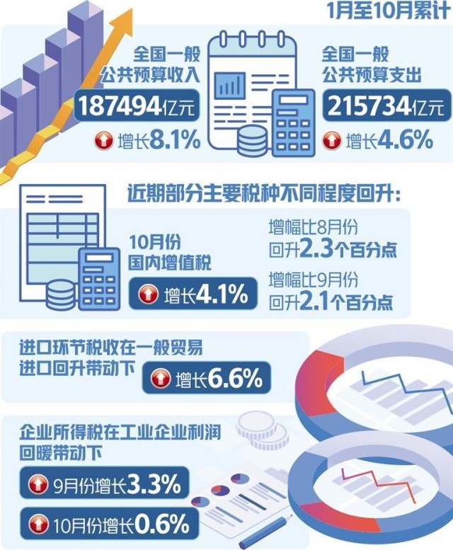 從稅收收入看,前10個(gè)月,全國稅收收入157841億元,同比增長10.7%。值得關(guān)注的是,近期部分主要稅種不同程度回升,其中10月份國內(nèi)增值稅增長4.1%,增幅比8月份、9月份分別回升2.3個(gè)、2.1個(gè)百分點(diǎn);進(jìn)口環(huán)節(jié)稅收在一般貿(mào)易進(jìn)口回升帶動(dòng)下,增長6.6%;企業(yè)所得稅在工業(yè)企業(yè)利潤回暖帶動(dòng)下,9月份、10月份分別增長3.3%、0.6%。