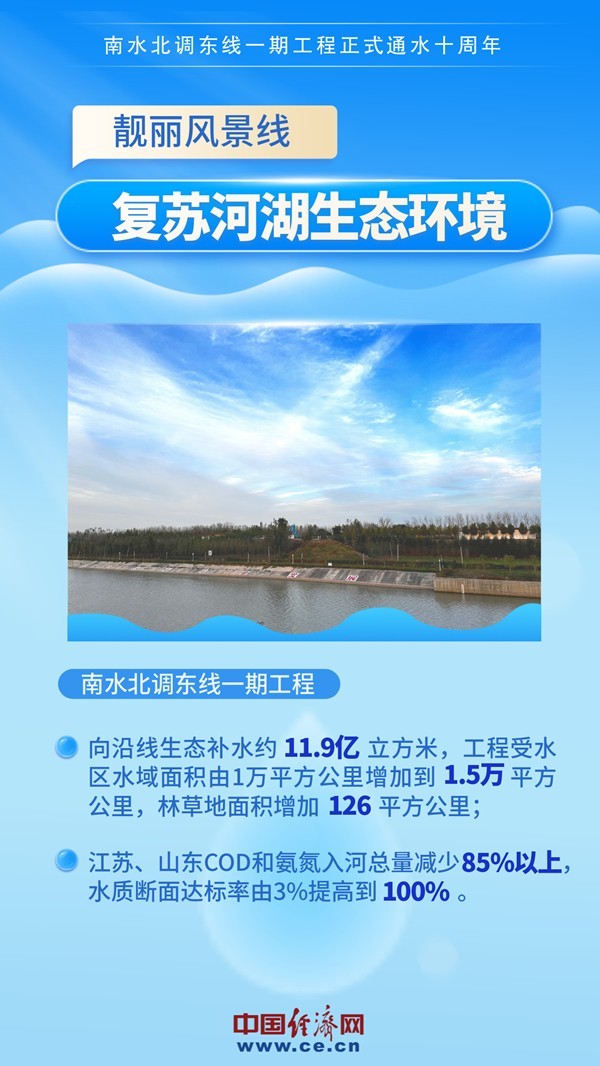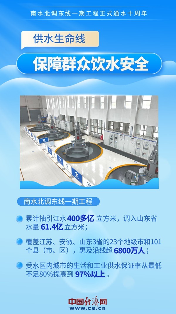 2013年11月15日,南水北調(diào)東線一期工程正式通水。通水10年來(lái),東線一期工程累計(jì)抽引江水400多億立方米,調(diào)入山東省水量61.4億立方米,有效緩解了南水北調(diào)東線沿線受水區(qū)缺水問(wèn)題,受益人口超6800萬(wàn)人,成為優(yōu)化水資源配置、保障群眾飲水安全、復(fù)蘇河湖生態(tài)環(huán)境、暢通南北經(jīng)濟(jì)循環(huán)的生命線。