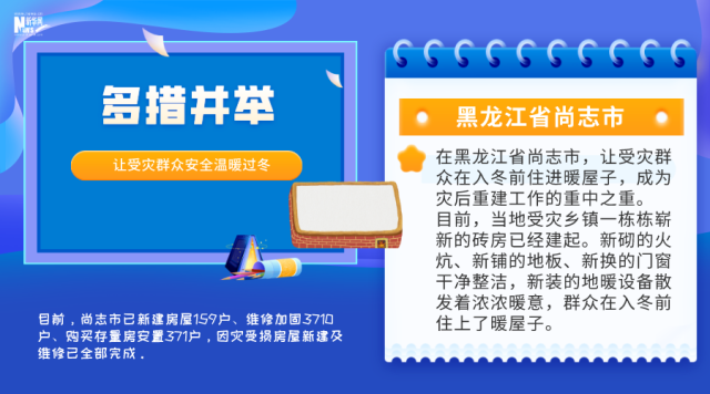 尚志市委書記劉海濤介紹,目前,尚志市已新建房屋159戶、維修加固3710戶、購買存量房安置371戶,因災(zāi)受損房屋新建及維修已全部完成。