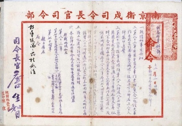 這是一份成文于1937年12月11日24時,有關(guān)“死守南京”的作戰(zhàn)命令——“衛(wèi)參作第44號”命令。該命令由當時南京衛(wèi)戍司令長官唐生智向教導總隊隊長桂永清下達,右上方加蓋有“南京衛(wèi)戍司令長官關(guān)防”章。