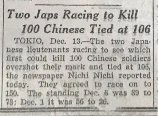 “根據(jù)《東京日日新聞》報道,兩名日本軍官比賽看誰能先殺死100名中國士兵,結(jié)果都殺了超過100人,雙方打平殺了106人,他們又同意重新比賽殺到150人為止,12月6日是89比78,12月1日是56比26。”這是1937年12月14日發(fā)行的《芝加哥每日論壇》中,一篇有關(guān)兩名日本軍官進行“百人斬”殺人競賽的報道節(jié)選。
