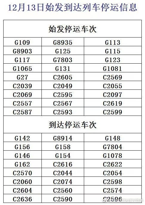 據(jù)北京西站官方微博今天中午最新消息,受降雪影響,12月13日,北京西站G57、G807、G97次列車臨時(shí)停運(yùn),北京豐臺(tái)站G63、G629次列車臨時(shí)停運(yùn)。今天早上,北京西站、北京豐臺(tái)站已發(fā)布部分停運(yùn)列車信息。已購(gòu)買停運(yùn)列車車票的旅客,可于30日內(nèi)辦理全額退票手續(xù)。請(qǐng)廣大旅客合理安排出行,關(guān)注車站公告或12306網(wǎng)站信息。