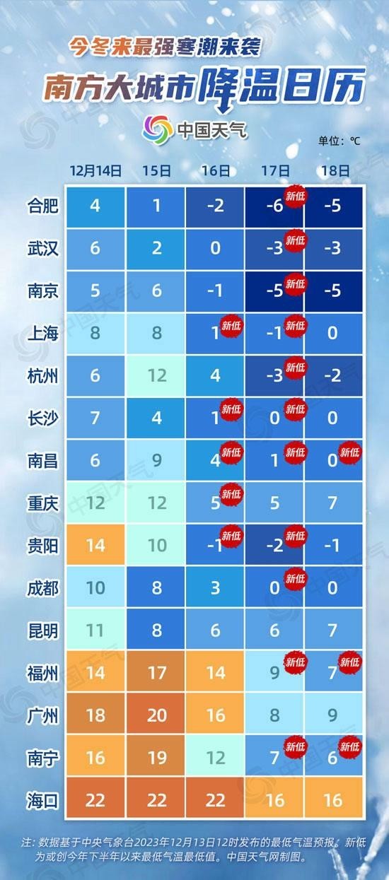從南方大城市降溫日歷來(lái)看,未來(lái)五天,合肥、武漢、南京、上海、杭州、貴陽(yáng)最低氣溫都將逐步下降到冰點(diǎn)以下。南昌16日至18日最低氣溫或連創(chuàng)新低,貴陽(yáng)最低氣溫將從14℃降至-2℃,降幅可達(dá)16℃。