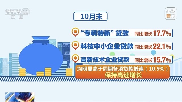 數(shù)據(jù)顯示,目前我國科技創(chuàng)新、制造業(yè)、綠色發(fā)展、普惠小微等重點領(lǐng)域貸款增量和占比都在明顯上升。10月末,“專精特新”、科技中小企業(yè)、高新技術(shù)企業(yè)貸款分別同比增長17.7%、22.1%、15.7%,均明顯高于同期各項貸款增速,保持高速增長。