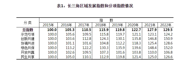 從測算結(jié)果看,以2015年為基期,2022年長三角區(qū)域發(fā)展指數(shù)為129.5,比上年提高1.6,年均提高4.2。