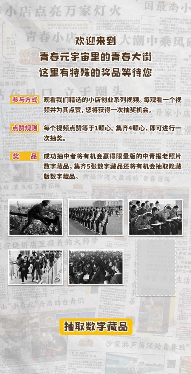 奔跑在青春大街上的青小豹邀請讀者一起玩尋找小店的游戲,大家可以邊體驗(yàn)邊觀看一個個小店和店主的故事,參加愛心點(diǎn)贊,還可以參與抽獎。獎品是用區(qū)塊鏈技術(shù)創(chuàng)制的數(shù)字藏品——改革開放45年以來中國青年報拍攝的精彩照片。