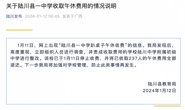 央視網(wǎng)消息:據(jù)“陸川發(fā)布”公眾號消息,1月12日,廣西陸川縣教育局通報關于一中學收取午休費用的情況說明:1月11日,網(wǎng)上出現(xiàn)“陸川縣一中學趴桌子午休收費”的信息,教育局立即組織人員進行調查,并責成收取費用的學校陸川中學附屬初級中學進行整改。該校已于1月11日停止收費,并將已收取237人的午休費用全部退還。下一步將加強對學校管理,防止此類事情再發(fā)生。