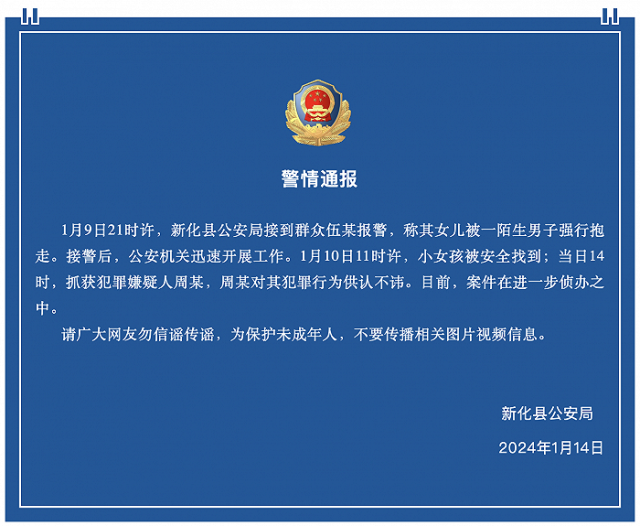 央視網(wǎng)消息:據(jù)“新化公安”公眾號消息,湖南新化縣公安局1月14日晚發(fā)布警情通報,1月9日21時許,新化縣公安局接到群眾伍某報警,稱其女兒被一陌生男子強行抱走。接警后,公安機關(guān)迅速開展工作。1月10日11時許,小女孩被安全找到;當日14時,抓獲犯罪嫌疑人周某,周某對其犯罪行為供認不諱。目前,案件在進一步偵辦之中。