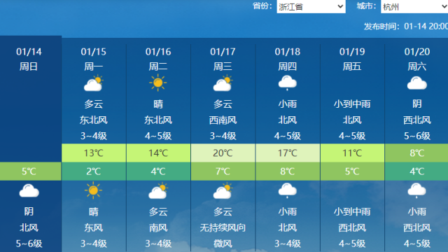 像是杭州,今天最高氣溫22.6℃,剛刷新當(dāng)?shù)?月中旬最高氣溫紀(jì)錄,明天氣溫陡降,雖預(yù)報最高氣溫14℃,但今晚開始?xì)鉁氐钩?,?shí)際明天下午最高氣溫將不足10℃,17日氣溫再度升至20℃,大幅偏高,20日又降至8℃。