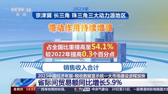 國家稅務總局新聞發(fā)言人 黃運:2023年,衡量國內(nèi)各省之間貿(mào)易聯(lián)系緊密程度的省際間貿(mào)易額同比增長5.9%,占全國貿(mào)易總額比重提高至42.7%,較2022年提高0.5個百分點,而且也呈逐年提升的態(tài)勢,反映經(jīng)濟內(nèi)循環(huán)更加順暢,統(tǒng)一大市場建設進程加快。