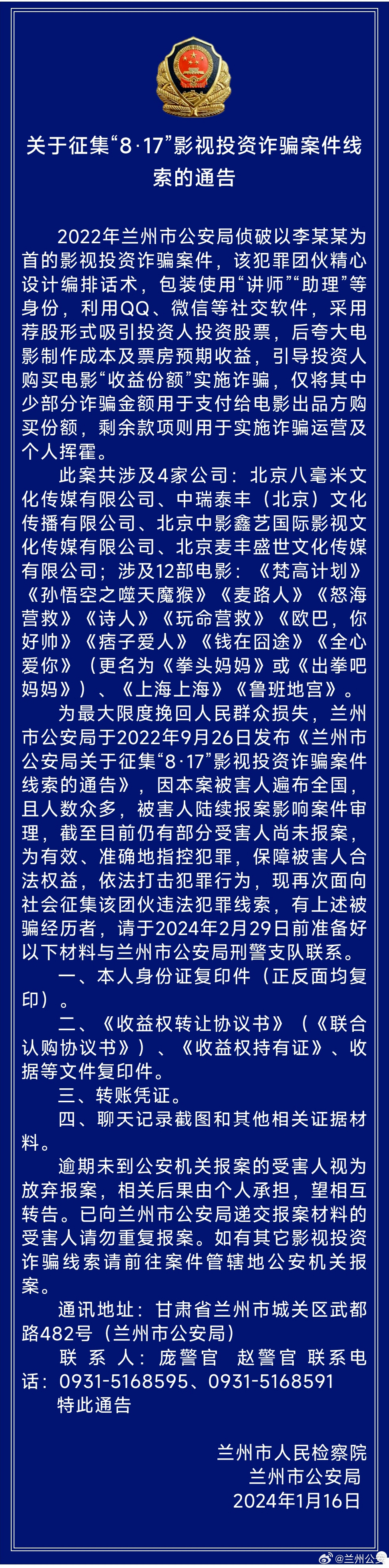 為最大限度挽回人民群眾損失,蘭州市公安局早在2022年9月26日發(fā)布《蘭州市公安局關(guān)于征集“8·17”影視投資詐騙案件線索的通告》,但因本案被害人遍布全國,且人數(shù)眾多,受害人陸續(xù)報(bào)案影響案件審理,截至目前仍有部分受害人尚未報(bào)案。