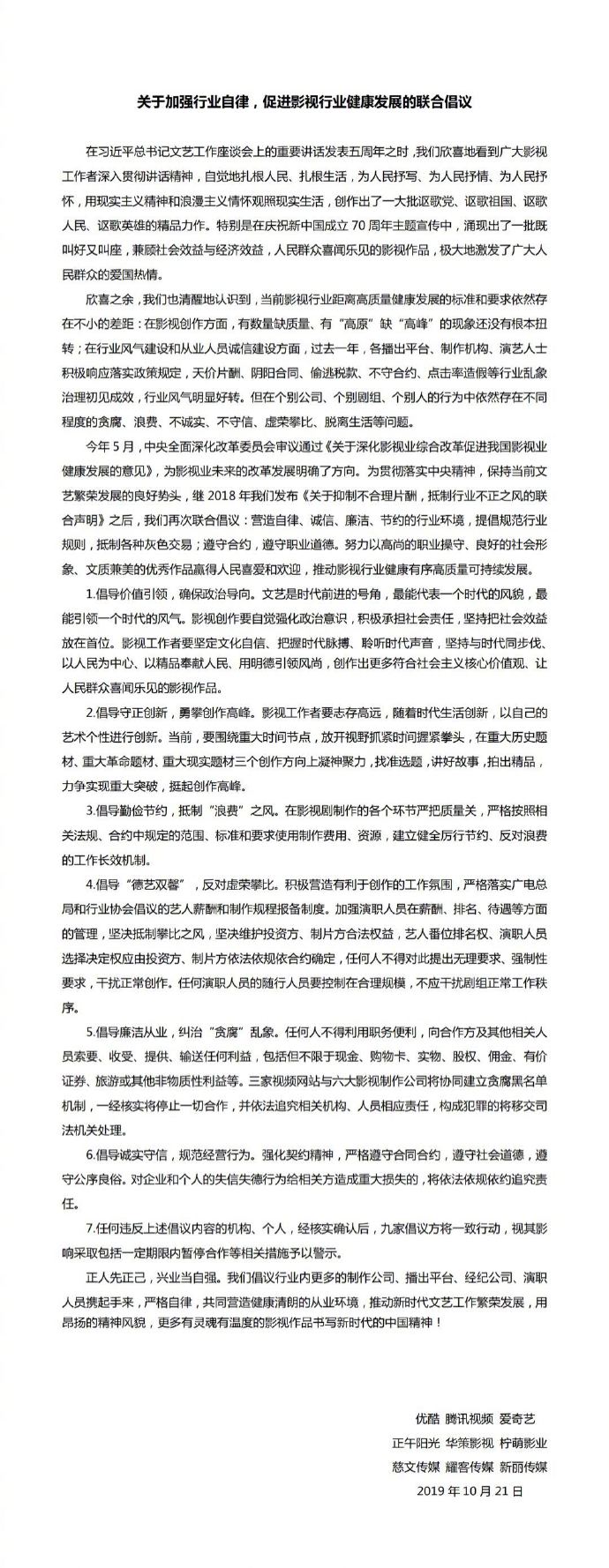為了避免娛樂圈的爭番、攀比等亂象,業(yè)界公司曾聯(lián)合發(fā)布自律倡議。2019年,優(yōu)酷、騰訊視頻、愛奇藝三家視頻網(wǎng)站,聯(lián)合正午陽光、華策影視、檸萌影業(yè)、慈文傳媒、耀客傳媒、新麗傳媒六大影視制作公司,共同發(fā)布《關(guān)于加強行業(yè)自律,促進(jìn)影視行業(yè)健康發(fā)展的聯(lián)合倡議》。