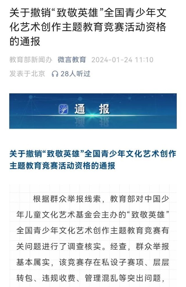 教育部1月24日通報(bào),根據(jù)群眾舉報(bào)線(xiàn)索,教育部對(duì)中國(guó)少年兒童文化藝術(shù)基金會(huì)主辦的“致敬英雄”全國(guó)青少年文化藝術(shù)創(chuàng)作主題教育競(jìng)賽有關(guān)問(wèn)題進(jìn)行了調(diào)查核實(shí)。經(jīng)查,群眾舉報(bào)基本屬實(shí),該競(jìng)賽存在私設(shè)子賽項(xiàng)、層層轉(zhuǎn)包、違規(guī)收費(fèi)、管理混亂等突出問(wèn)題,在社會(huì)上造成了惡劣影響。