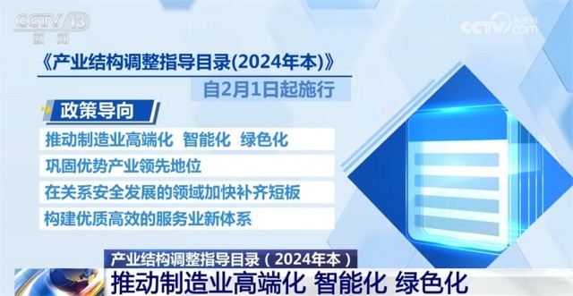 《產(chǎn)業(yè)結(jié)構(gòu)調(diào)整指導目錄(2024年本)》自2月1日起施行?!赌夸洠?024年本)》的政策導向是,推動制造業(yè)高端化、智能化、綠色化,鞏固優(yōu)勢產(chǎn)業(yè)領(lǐng)先地位,在關(guān)系安全發(fā)展的領(lǐng)域加快補齊短板,構(gòu)建優(yōu)質(zhì)高效的服務(wù)業(yè)新體系。
