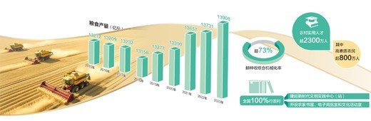 2023年,克服黃淮罕見“爛場雨”、華北東北局地嚴重洪澇、西北局部干旱等災(zāi)害影響,全年糧食產(chǎn)量13908.2億斤,高基數(shù)上增產(chǎn)177.6億斤,再創(chuàng)歷史新高;大豆播種面積穩(wěn)中有增,連續(xù)兩年穩(wěn)定在1.5億畝以上。今年中央一號文件明確提出確保糧食產(chǎn)量保持在1.3萬億斤以上的目標,重點是穩(wěn)面積、增單產(chǎn)兩手發(fā)力。