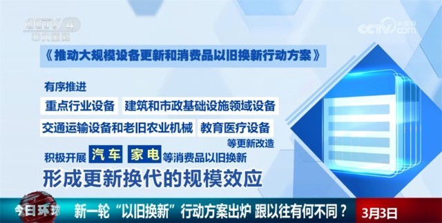 央視網消息:日前,國務院常務會議審議通過了《推動大規(guī)模設備更新和消費品以舊換新行動方案》。行動方案有哪些亮點?新一輪“以舊換新”和以往有什么不同?來看專家的解讀。