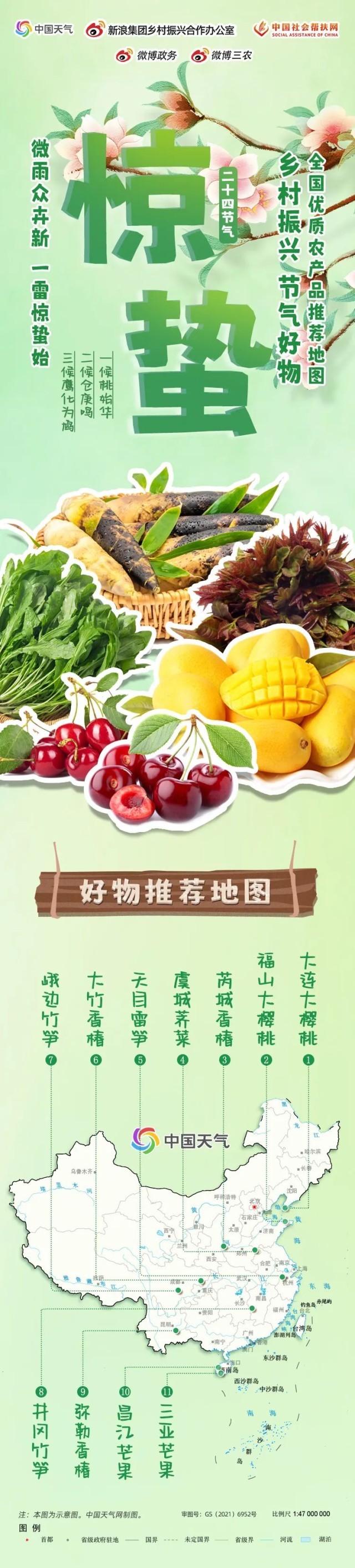 在這個(gè)春雷乍響,萬(wàn)物生長(zhǎng)的節(jié)氣里,又有哪些春季的舌尖美味呢,來(lái)看看由中國(guó)天氣網(wǎng)、中國(guó)社會(huì)幫扶網(wǎng)聯(lián)合推出的“鄉(xiāng)村振興·節(jié)氣好物”全國(guó)優(yōu)質(zhì)農(nóng)產(chǎn)品推薦地圖驚蟄篇吧!