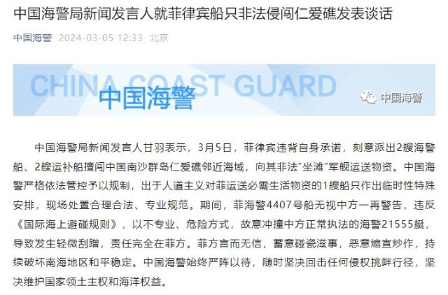 中國(guó)海警局新聞發(fā)言人就菲律賓船只非法侵闖仁愛(ài)礁發(fā)表談話