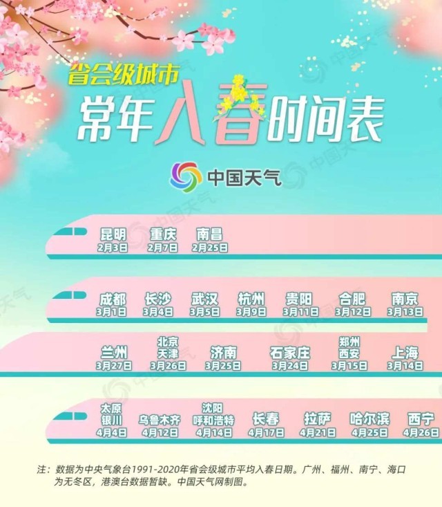 常年3月,是我國(guó)入春最集中的一段時(shí)間,此時(shí)往往有15個(gè)省會(huì)級(jí)城市完成冬春轉(zhuǎn)換。3月上旬,成都、長(zhǎng)沙、武漢、杭州等地率先進(jìn)入氣象學(xué)意義上的春天;3月中旬,貴陽、合肥、南京、上海、鄭州、西安等地邁入春天的門檻;3月下旬,華北、黃淮一帶的石家莊、濟(jì)南、北京、天津等地也投入春的懷抱。