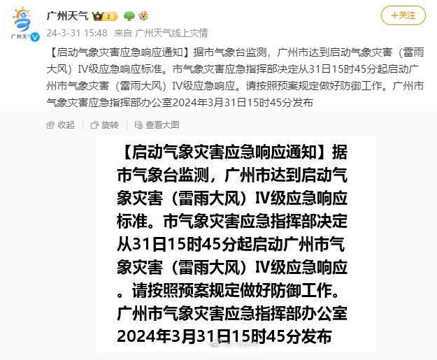 廣州啟動氣象災害(雷雨大風)Ⅳ級應急響應