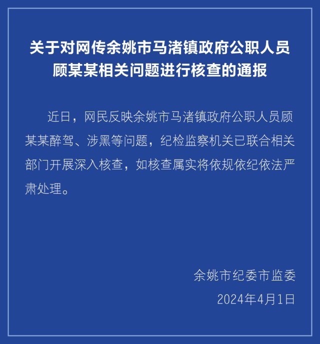 鎮(zhèn)政府公職人員醉駕、涉黑?浙江余姚市紀(jì)委市監(jiān)委:開(kāi)展深入核查