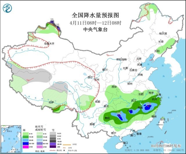 4月11日08時至12日08時,新疆北疆北部、內蒙古東北部、黑龍江西北部、西藏西部和中北部、青海南部、川西高原等地部分地區(qū)有小到中雪或雨夾雪,其中,新疆北疆北部高海拔地區(qū)有大到暴雪,局地大暴雪(20~25毫米)。貴州東部、廣西北部、江南大部的部分地區(qū)有中到大雨,其中,湖南東部和西南部、廣西北部、江西東北部、浙江西南部、福建西北部等地部分地區(qū)有暴雨或大暴雨(100~120毫米)。內蒙古西北部、西藏西部等地部分地區(qū)有4~5級風。