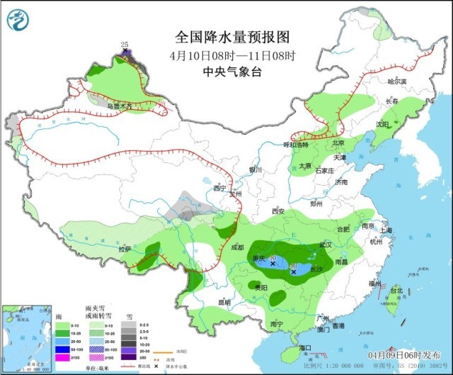 4月10日08時至11日08時,新疆北疆北部、黑龍江西北部、西藏中部和北部、青海東南部、川西高原北部等地部分地區(qū)有小到中雪或雨夾雪,其中,新疆北疆北部高海拔地區(qū)有大到暴雪,局地大暴雪(20~25毫米)。內蒙古東部、華北北部、東北地區(qū)東部、新疆北部、西藏東部、四川盆地大部、重慶、江淮西部、江漢、江南北部和西部、貴州大部、廣西大部、云南西部和南部、海南島、臺灣島等地部分地區(qū)有小到中雨,其中,重慶東南部、貴州北部、湖南中西部等地部分地區(qū)有大雨(25~40毫米)。新疆東部部分地區(qū)有6~7級風。