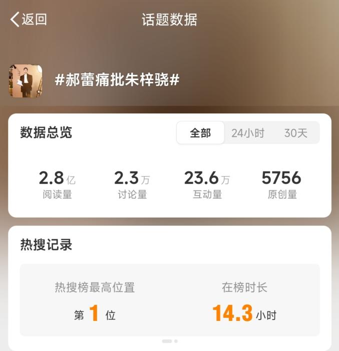 “郝蕾痛批朱梓驍”詞條登上熱搜第一。微博截圖
