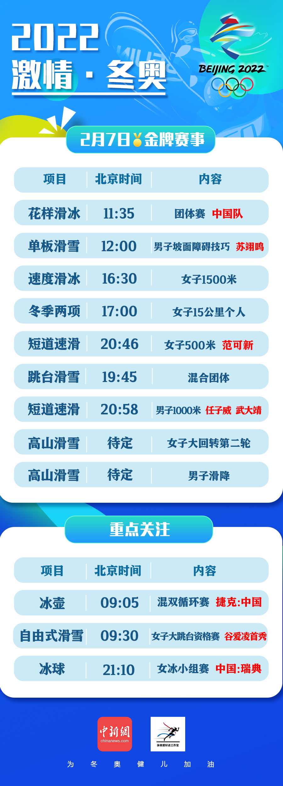 中新網(wǎng)2月7日電 蘇翊鳴爭(zhēng)冠、谷愛凌首秀、中國短道速滑再?zèng)_金、速度滑冰“冬奧獎(jiǎng)牌王”有望擴(kuò)大紀(jì)錄……7日的北京冬奧賽場(chǎng),諸多看點(diǎn)值得期待。