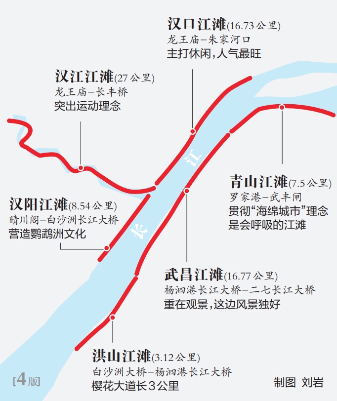 自1998年以來,武漢市持續(xù)實施“兩江四岸”江灘防洪及環(huán)境綜合整治工程。截至目前,建成長79.65公里、面積831公頃、綠地面積527公頃的江灘公園。